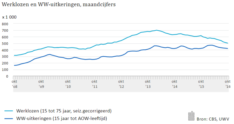 Hinke Wever 17 november 2016 0 reacties Print CBS: werkloosheid daalt naar 5,6%De werkloosheid nam in de afgelopen drie maanden met 13 duizend per maand af en kwam in oktober uit op 502 duizend, oftewel 5,6 procent van de beroepsbevolking. Het dalingstempo uit de (na)zomer van 2016 zet zich ook door in het najaar. Dat meldt CBS. UWV telde eind oktober 420 duizend WW-uitkeringen. Het totaal aantal mensen op de arbeidsmarkt nam net als in de zomer verder toe. Dat betekent dat het aantal werkenden harder toeneemt dan de werkloosheid daalt. Vooral 45-plussers zijn weer vaker aan het werk. UWV: gestage daling WW-uitkeringen Het aantal lopende WW-uitkeringen laat vanaf april dit jaar een daling zien. UWV telde eind oktober 420 duizend lopende WW-uitkeringen, 5 duizend (-1,1 procent) minder dan in september. Vanuit de bouwnijverheid (-5,5 procent) en het onderwijs (-4,0 procent) daalde het aantal WW-uitkeringen het sterkst in oktober. In de zorg- en welzijnssector is er sinds begin dit jaar sprake van een positieve trend. Deze sector telde eind oktober 72 duizend lopende WW-uitkeringen, 1,8 procent minder dan in september en 4 procent minder dan een jaar geleden. Alleen vanuit seizoengevoelige sectoren als horeca (+4,1 procent) en landbouw (+3,8 procent) nam het aantal uitkeringen toe in oktober. UWV verstrekt minder nieuwe uitkeringen in 2016 UWV verstrekte tot en met oktober dit jaar 411 duizend nieuwe WW-uitkeringen, 67 duizend (-14,1 procent) minder dan in dezelfde periode vorig jaar. Bij de sectoren lopen de ontwikkelingen uiteen van een daling voor de bouwnijverheid met 29,6 procent tot een stijging voor het grootwinkelbedrijf met 30,3 procent. Dit laatste is het gevolg van enkele grote faillissementen in deze sector dit jaar. Daling werkloosheid sterk in Europees perspectief De werkloosheid in Nederland daalt in 2016 sterker dan gemiddeld in de Europese Unie. Vergeleken met de omringende landen is de daling in Nederland het sterkst. In landen uit het oosten van Europa daalt de werkloosheid nog sterker. Tsjechië heeft momenteel zelfs de laagste werkloosheid in de EU, Hongarije is Nederland inmiddels voorbijgestreefd en Polen volgt op de voet. Bron: CBS, 17 oktober 2016 arbeidsmarkt, CBS, UWV, werkloosheid, WW Print Over de auteur Over Hinke Wever Hinke Wever is een creatieve verbinder van werk- en levensterreinen. Ze was als redacteur vanaf de start betrokken bij FlexNieuws. Bekijk alle berichten van Hinke Wever
