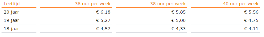 Naar aanleiding van een toezegging aan de Tweede Kamer worden de afgeleide minimumuurlonen bij deze normale arbeidsduren in de toelichting gepubliceerd.2 Onderstaand schema geeft de afgeronde brutobedragen per uur aan, berekend op basis van het wettelijk minimumweekloon bij een arbeidsduur van respectievelijk 36, 38 en 40 uur per week.