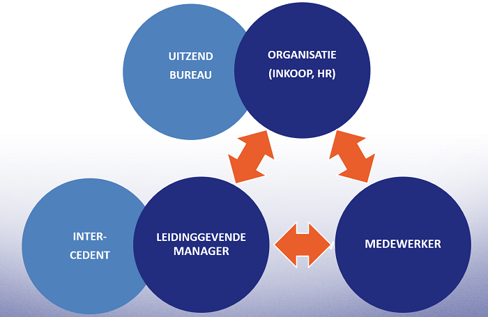 Temeer omdat de uitzendkracht niet alleen wordt aangestuurd door de organisatie waar hij werkt en door de leidinggevende op de werkvloer binnen het team medewerkers. Op de achtergrond heeft hij te maken met de intercedent die hem heeft geplaatst, dat is de eerste op wie hij terug moet vallen als er iets mis gaat. Ondertussen heeft de uitzendorganisatie die hem uitleent een relatie met en een zekere afhankelijkheid van de opdrachtgever. Met andere woorden hoeveel belangen spelen er en hoeveel ‘bazen’ kan een mens hebben? Wie slaat er voor de uitzendkracht met de vuist op tafel als er iets in het werkproces of de manier van omgaan misgaat? Bij wie kan de uitzendkracht terecht als het erop aankomt? Is er een psychologisch veilige arbeidsrelatie of wordt er gezegd: “Niet goed? Voor jou tien anderen…”