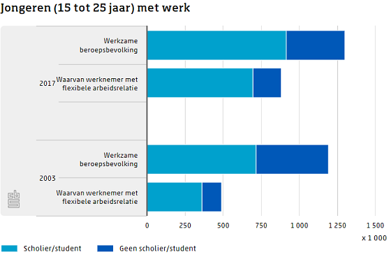Hinke Wever 23 april 2018 0 reacties Print Toename flexwerk vooral voor jongeren met bijbaanHet aantal werknemers met een flexibele arbeidsrelatie is tussen 2003 en 2017 toegenomen met 856 duizend. Hiermee had bijna een kwart van de werkzame beroepsbevolking een flexibel contract in 2017. Vooral onder jongeren (15 tot 25 jaar) nam het aantal flexwerkers toe. Dit zijn veelal studerende en schoolgaande jongeren met een bijbaan. Dit meldt het CBS. Het aantal werkzame jongeren is tussen 2003 en 2017 toegenomen van 1,2 miljoen naar 1,3 miljoen. Het aantal jonge werknemers met een flexibel contract nam met bijna 400 duizend toe, terwijl het aantal vaste contracten afnam met ruim 300 duizend. Hierdoor is het aandeel flexwerkers onder jongeren toegenomen van 41 procent in 2003 tot 68 procent in 2017. Ook meer flexwerk bij 25-plussers Van de 25- tot 45-jarigen waren in 2017 bijna twee op de tien werkzaam in een flexibele arbeidsrelatie. In 2003 was dit nog één op de tien. Het aantal 25- tot 45-jarigen neemt in Nederland af. Het aantal flexwerkers nam desondanks toe met 266 duizend personen, terwijl het aantal werknemers met een vaste arbeidsrelatie afnam met 811 duizend. Het aantal 45-plussers groeide sterk. Het aantal werknemers met een flexibele arbeidsrelatie nam toe met 197 duizend. Maar ook het aantal werknemers met een vaste arbeidsrelatie en het aantal zelfstandigen steeg, samen met ongeveer een miljoen. Hierdoor is het aandeel flexibele werknemers onder 45-plussers licht gegroeid van 7 procent naar 10 procent. Een studie en een bijbaan Van de 883 duizend jongeren met een flexibele arbeidsrelatie in 2017 waren bijna acht op de tien scholier of student. Het gaat dan vooral om jongeren die naast het volgen van onderwijs een bijbaan hebben. De groei van het aantal flexibele werknemers onder jongeren zit ook hoofdzakelijk bij deze scholieren en studenten, 335 duizend sinds 2003. Onder niet-schoolgaande jongeren waren dit er 57 duizend meer. Enerzijds is de groep scholieren en studenten met werk in omvang gegroeid, vooral doordat steeds meer jongeren een opleiding in het hoger onderwijs volgen. Hierdoor blijven ze langer dan voorheen in het onderwijs. Anderzijds hebben scholieren en studenten die werken steeds vaker een flexibele arbeidsrelatie. Dat geldt voor ruim driekwart van de schoolgaande jongeren in 2017, in 2003 was dit nog de helft. Op deze manier kunnen zij de studie- en werkactiviteiten combineren. De voornaamste reden voor het hebben van een flexibel contract is voor jongeren de behoefte aan flexibiliteit. Daarnaast waren er 382 duizend niet-schoolgaande jongeren met werk in 2017. Bijna de helft van hen had een flexibele arbeidsrelatie in 2017. In 2003 was dit nog 27 procent. Bron: CBS, 23 april 2018 CBS, flexibele contracten, flexwerk Print Over de auteur Over Hinke Wever Hinke Wever is een creatieve verbinder van werk- en levensterreinen. Ze was als redacteur vanaf de start betrokken bij FlexNieuws. Bekijk alle berichten van Hinke Wever