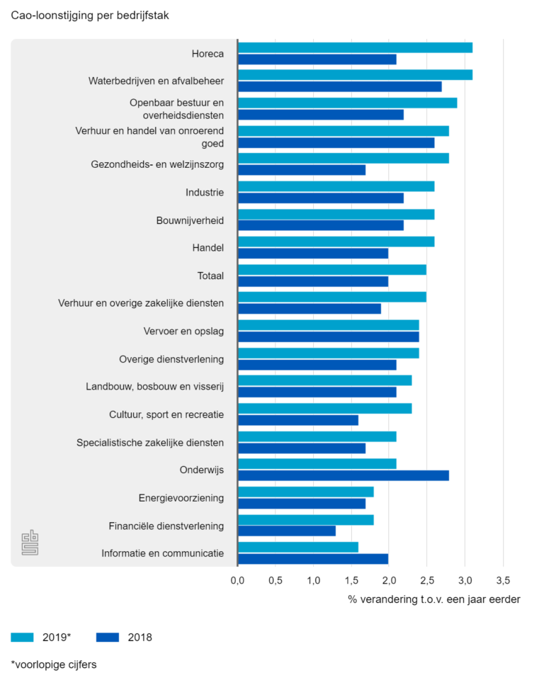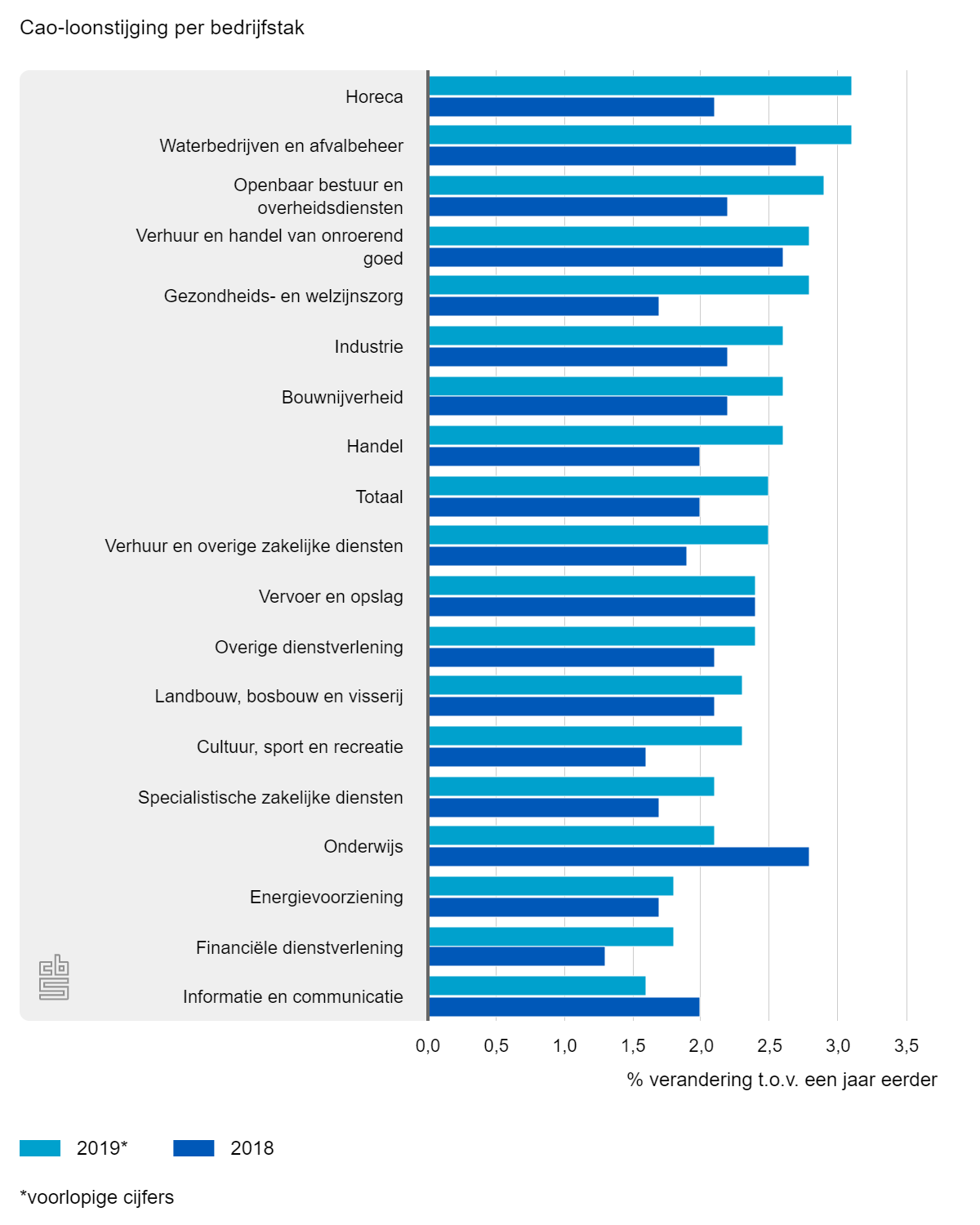 De werknemers in de bedrijfstakken horeca en de waterbedrijven en afvalbeheer hadden in 2019 de hoogste cao-loonstijging (3,1 procent). De bedrijfstak informatie en communicatie had met 1,6 procent de laagste cao-loonstijging.