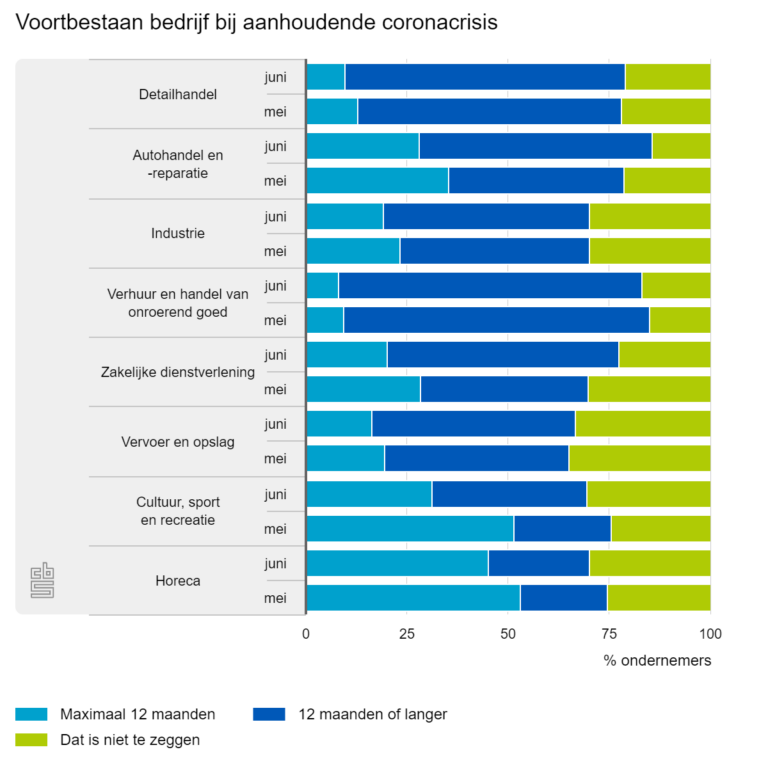 Hinke Wever 8 juli 2020 0 reacties Print In meeste sectoren minder zorgen over voortbestaanIn juni hebben bedrijven in alle sectoren van het niet-financiële bedrijfsleven meer vertrouwen in hun voortbestaan. In de meeste sectoren dacht meer dan de helft van de bedrijven in juni minstens nog een jaar te bestaan. In mei was dit nog alleen in de onroerend goed sector, de detailhandel en de informatie en communicatie het geval. Dat blijkt uit cijfers van het CBS op basis van onderzoek naar de verwachte gevolgen van de coronacrisis. Het onderzoek werd begin juni onder bedrijven gehouden. Zakelijke dienstverlening, waaronder uitzenders, hebben meer vertrouwen Het toegenomen vertrouwen in het voortbestaan van het eigen bedrijf tijdens de coronacrisis is in juni vooral zichtbaar in de zakelijke dienstverlening. Vergeleken met mei steeg het aantal zakelijke dienstverleners dat verwacht minstens nog een jaar te kunnen overleven met 16 punten naar 57 procent. Binnen de zakelijke dienstverlening was de toename het sterkst in de reisbranche (+41 punten naar 51 procent). Verder nam het vertrouwen in de continuïteit sterk toe bij uitzendbureaus, juridische diensten, en beveiligingsbedrijven. Vertrouwen in voortbestaan het grootst in onroerendgoedsector en detailhandel In de verhuur en handel in onroerend goed is het vertrouwen in het voortbestaan het hoogst, 75 procent van de bedrijven dacht het in juni minstens nog een jaar te kunnen volhouden, evenveel als in mei. In de detailhandel ging in juni 69 procent van de bedrijven uit van nog minimaal twaalf maanden voortbestaan, 4 procentpunten meer dan in mei. Minste vertrouwen in voortbestaan in horeca en cultuur, sport en recreatie In de horeca (25 procent) en bij bedrijven in de sport, cultuur en recreatie (38 procent) was het vertrouwen in minstens nog een jaar activiteit in juni het laagst. Van mei naar juni groeide het aantal bedrijven dat verwachtte minstens nog een jaar te bestaan in deze sectoren wel met respectievelijk 4 en 14 punten. In de horeca dacht een derde van de bedrijven het in de huidige omstandigheden nog 5 maanden of korter te kunnen volhouden, terwijl 30 procent aangaf niet te kunnen zeggen wat de overlevingskansen zijn. In de cultuur, sport en recreatie kan eveneens 30 procent van de bedrijven de overlevingskansen niet inschatten, terwijl 19 procent dacht nog 5 maanden of korter te kunnen voortbestaan. Bron: CBS, 8 juli 2020 bedrijven, CBS, coronacrisis Print Over de auteur Over Hinke Wever Hinke Wever is een creatieve verbinder van werk- en levensterreinen. Ze was als redacteur vanaf de start betrokken bij FlexNieuws. Bekijk alle berichten van Hinke Wever