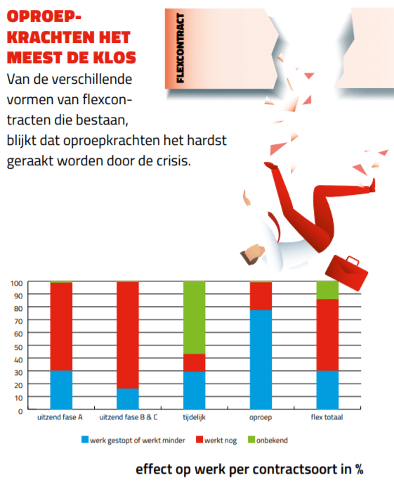 Hinke Wever 15 juli 2020 0 reacties Print FNV: limiteer uitzendwerk tot maximaal 26 wekenDoor de coronacrisis is 80% van de oproepkrachten werk verloren. Ook bijna 30% van de uitzendkrachten zijn hun baan kwijtgeraakt. Dit blijkt uit een enquête van FNV Flex en Naleving onder 1000 flexwerkers en cijfers van het UWV. De FNV vindt dat de crisis aantoont dat het nodig is dat alle flexwerkers, oproepkrachten en uitzendkrachten, meer zekerheid moeten krijgen over werk en inkomen. Vaste banen zouden weer de norm moeten zijn, waarbij flexibel werk – waaronder uitzendwerk – alleen wordt ingezet bij piek en ziek. Uitzenden beperken tot 26 weken FNV pleit ervoor om de toegestane uitzendfases te verkorten. Op dit moment is het mogelijk uitzendcontracten te bieden gedurende 78 weken. De vakbond wil dit beperken tot 26 weken. De FNV voelt zich gesteund door de aanbevelingen van de commissie Borstlap om de onzekere fasen van uitzendwerk terug te brengen tot een half jaar. Oproepkrachten vooral de dupe Voor oproepkrachten zijn de gevolgen van de crisis dramatisch. Niet alleen stond 80% op straat of viel flink terug in het aantal uren, uit de enquête blijkt ook dat 50% geen vangnet heeft bij het (deels) wegvallen van werk en inkomen. Sinds 2003 is het aantal oproepkrachten meer dan verdubbeld. De FNV vindt dat er, naast een gegarandeerd aantal uren, een halt moet komen aan deze explosie van oproepcontracten. Ook hierbij verwijst FNV naar de commissie Borstlap; er is een aanpassing nodig in de wet, zodat ook deze werknemers meer zekerheid krijgen. Bron: FNV, 15 juli 2020 Zie voor aantallen en verschillen tussen typen flexwerkers de Flexbarometer, een initiatief van ABU, FNV, CNV en CBS/TNO. Zie ook Aanvraag tegemoetkoming flexwerkers vanaf eind juni Werkloosheid in juni gestegen naar 4,3 procent Steeds meer oproepkrachten, ondanks afspraken sociale partners Vooral uitzendkrachten in eerste kwartaal vaker zonder werk coronacrisis, FNV, oproepcontract, Uitzenden Print Over de auteur Over Hinke Wever Hinke Wever is een creatieve verbinder van werk- en levensterreinen. Ze was als redacteur vanaf de start betrokken bij FlexNieuws. Bekijk alle berichten van Hinke Wever