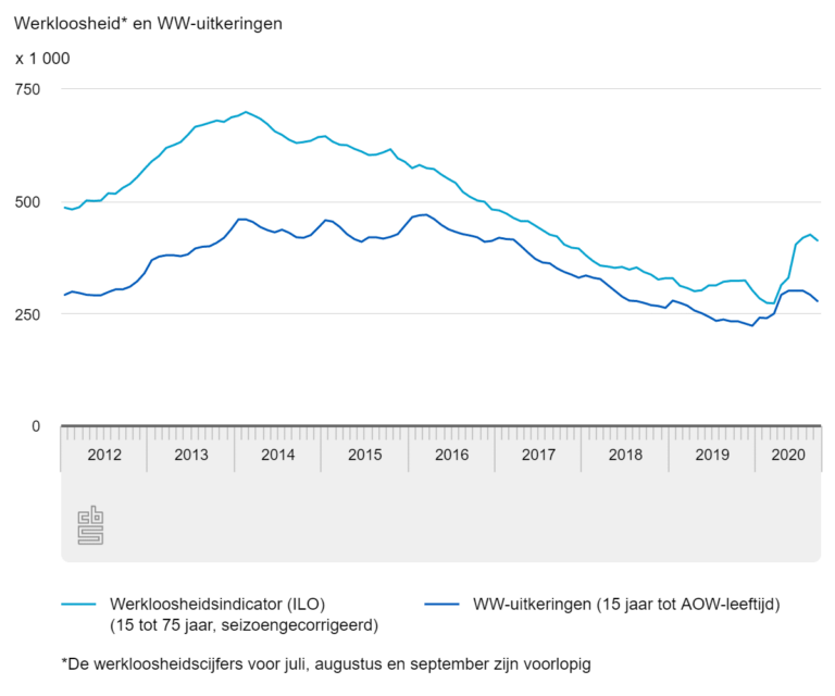 Hinke Wever 15 oktober 2020 0 reacties Print Werkloosheid vlakt af naar 4,4 procent in septemberIn september waren 413 duizend mensen werkloos, dat is 4,4 procent van de beroepsbevolking. In vergelijking met augustus daalde de werkloosheid en is de stijging van de afgelopen maanden afgevlakt. In de afgelopen drie maanden kwamen er gemiddeld 3 duizend werklozen per maand bij. In juni tot en met augustus steeg het aantal werklozen nog met gemiddeld 32 duizend per maand en was het werkloosheidspercentage gestegen naar 4,6. Het aantal werkenden nam in de afgelopen drie maanden ook licht toe, met gemiddeld 2 duizend per maand. Dat meldt het CBS op basis van nieuwe cijfers over de beroepsbevolking. UWV registreerde eind september 278 duizend lopende WW-uitkeringen. De beroepsbevolking (alle werkenden en werklozen samen) groeide in de afgelopen drie maanden met gemiddeld 5 duizend mensen per maand. Hiermee is het aantal mensen op de arbeidsmarkt met 9,3 miljoen op een vergelijkbaar niveau als in de eerste drie maanden van 2020. Dit komt met name doordat in deze periode meer werklozen werk vonden (van werkloos naar werkzaam), dan werkenden een baan verloren (van werkzaam naar werkloos). 4,2 miljoen mensen hadden in september om uiteenlopende redenen geen betaald werk. Naast werklozen ging het om 3,8 miljoen mensen die niet recent hebben gezocht en/of niet direct voor werk beschikbaar waren. Zij worden niet tot de beroepsbevolking gerekend. Hun aantal is in de laatste drie maanden met gemiddeld duizend per maand gedaald. UWV: Opnieuw een daling van het aantal WW-uitkeringen Net als in augustus daalde ook in september het aantal lopende WW-uitkeringen. UWV verstrekte eind september 278 duizend WW-uitkeringen, ruim 13 duizend minder dan eind augustus (292 duizend WW-uitkeringen). In bijna elke sector is het aantal WW-uitkeringen gedaald. De afname was vooral zichtbaar onder jongeren tussen de 15 en 25 jaar (-17,6 procent). Bron: CBS, 15 oktober 2020 beroepsbevolking, CBS, werkloosheid Print Over de auteur Over Hinke Wever Hinke Wever is een creatieve verbinder van werk- en levensterreinen. Ze was als redacteur vanaf de start betrokken bij FlexNieuws. Bekijk alle berichten van Hinke Wever