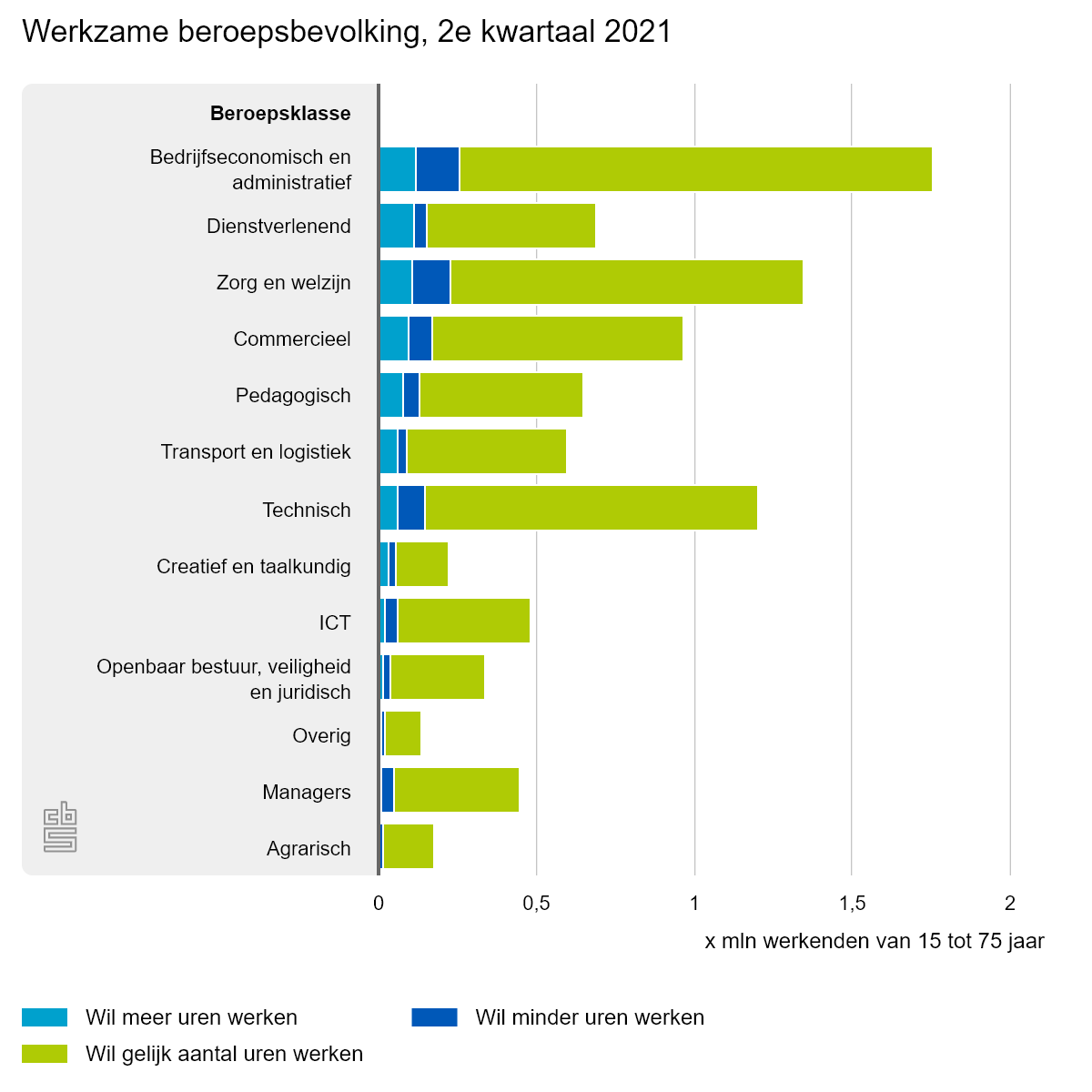 Redactie FlexNieuws 26 oktober 2021 0 reacties Print CBS: steeds minder werkenden willen meer urenSinds begin 2015 is het aantal werkenden dat meer uren wil werken vrijwel voortdurend gedaald, behalve tijdens het begin van de coronacrisis in Q2 2020. Het gaat veelal om mensen met een bedrijfseconomisch of administratief beroep of dienstverlenende en zorg- of welzijnsberoepen. Dat meldt het CBS op basis van de nieuwste cijfers uit de Enquête beroepsbevolking (EBB). 354.000 onbenutte deeltijders In Q2 2021 hadden 9,0 miljoen mensen van 15 tot 75 jaar betaald werk. Het overgrote deel (7,6 miljoen) wil een gelijk aantal uren blijven werken. Daarnaast gaven 682.000 mensen aan minder uren te willen werken, ook als dat gevolgen heeft voor het inkomen. De overige 759.000 werkenden gaven aan meer uren te willen werken, ongeacht hun beschikbaarheid. Een deel van hen zijn zogenoemde onderbenutte deeltijders: het gaat om 354.000 deeltijders (werken minder dan 35 uur per week) die niet alleen meer willen werken, maar hiervoor ook op korte termijn (twee weken) beschikbaar zijn. Minder uren Het aantal mensen dat minder uren wil werken ontwikkelde zich in de afgelopen jaren tegengesteld aan het aantal dat meer uren wil werken. Naarmate de werkloosheid afnam, slonk het aantal werkenden dat meer uren zou willen werken, van ruim een miljoen in Q2 2014 naar 759.000 in Q2 2021. Het aantal werkenden dat minder uren wil werken steeg van 520.000 in Q2 2012 naar 780.000 in Q2 2019. Na een daling in Q2 2020 is dit aantal in 2021 weer iets toegenomen. Meer uren In bedrijfseconomische en administratieve beroepen geven de meeste werkenden aan dat ze meer uren willen werken (123.000). Dit is overigens ook de grootste beroepsklasse, met in totaal 1,8 miljoen werkenden. Ook in zorg- en welzijnsberoepen werken veel mensen (1,3 miljoen) en zijn er veel werkenden die meer uren willen werken (111.000). In dienstverlenende beroepen werken beduidend minder mensen (691.000), maar is het aantal werkenden dat meer wil werken bijna even groot (113.000) als in de twee grootste beroepsklassen. Bij dienstverlenende beroepen gaat het bijvoorbeeld om schoonmakers en kelners en barpersoneel die aangeven meer uren te willen werken. Anderhalve dag meer per week De groep werkenden die in Q2 2021 aangaf graag meer uren te willen werken werkte gemiddeld 21 uur per week, en wil gemiddeld 12 uur per week meer gaan werken. Van hen had 40% een vast dienstverband met vaste uren, 35% een flexibel contract of flexibele uren en 26% werkte als zelfstandige. Het aantal uitzendkrachten dat meer uren wil werken is 46.000, en 116.000 werknemers met een tijdelijk contract willen meer werken. De helft van de 759 duizend werkenden die meer uren willen werken behoren tot de jongere leeftijdsgroepen. Bron: CBS, 21 oktober 2021 arbeidsuren, CBS, enquête Print Over de auteur Over Redactie FlexNieuws Redactie van Flexnieuws - interviews, artikelen, aankondigingen en persberichten. Bekijk alle berichten van Redactie FlexNieuws