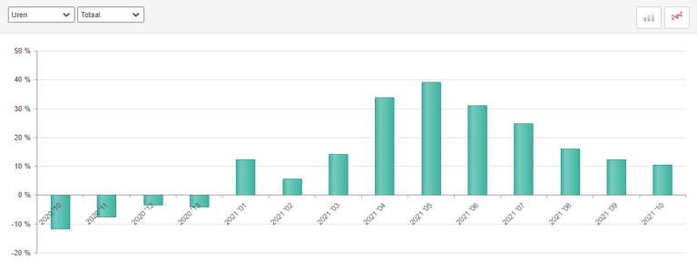 In periode 10 van 2021 (13 september tot en met 10 oktober) steeg het aantal uren met 10% en steeg de omzet met 13% in vergelijking met dezelfde periode vorig jaar. Omdat deze periode evenveel werkbare dagen telde als in dezelfde periode vorig jaar, is er geen correctie toegepast.