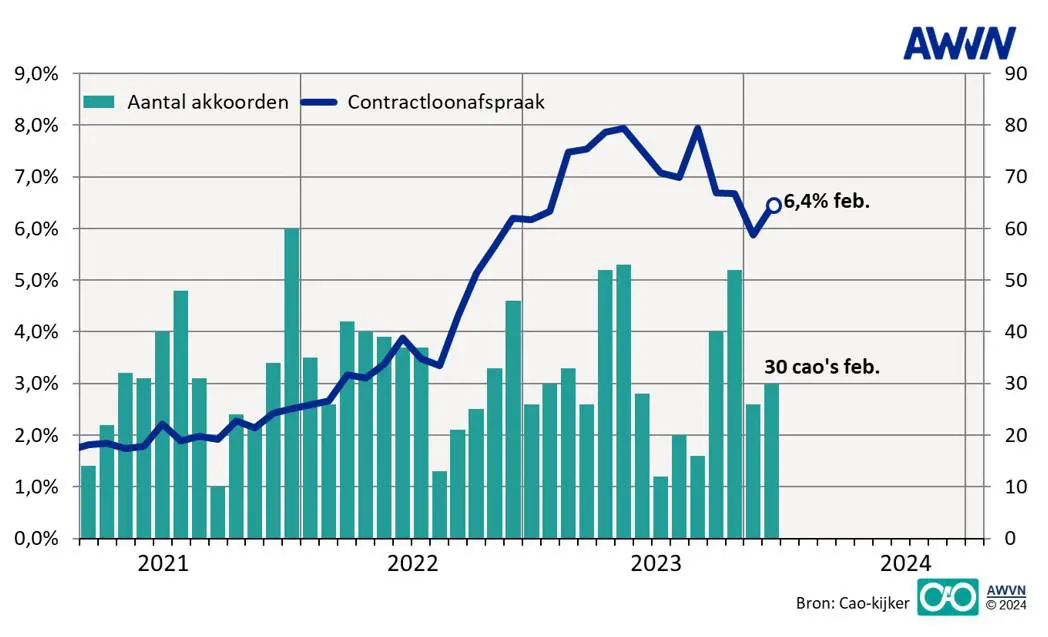 Redactie FlexNieuws 18 maart 2024 0 reacties Print AWVN: loonafspraken februari iets hoger, trend blijft dalendIn februari 2024 kwamen nieuwe loonafspraken uit op gemiddeld 6,4 procent. Dit is iets hoger dan januari, maar de trend blijft dalend. Dat meldt AWVN in haar cao-maandbericht over februari.In februari zijn 30 cao-akkoorden afgesloten voor 180.000 werknemers. Het aantal februari-cao’s ligt iets hoger dan gebruikelijk. Dat het maandgemiddelde in februari iets boven de trend is, komt door een aantal hoog afgesloten cao’s. Het betreft cao’s die al waren afgesloten vóór de inflatie opliep. Als alleen naar de cao’s wordt gekeken die in de afgelopen twee jaar al wel een keer zijn vernieuwd, is de dalende trend nog beter zichtbaar. AWVN houdt wel rekening met nieuwe uitschieters in de dalende trend. Er is nog een aantal cao’s dat voor het laatst vernieuwd is in de periode voordat de inflatie extreem opliep. Als die akkoorden alsnog tot stand komen, kunnen die het maandgemiddelde opnieuw incidenteel opdrijven. AWVN: dalende trend loonafspraken doorgezet in januari De sinds afgelopen zomer dalende trend in de loonafspraken volgt op de gedaalde inflatie, de iets ruimere arbeidsmarkt en de slechtere economie gedurende het grootste deel van 2023. De hoge inflatie in 2022 en begin 2023, in combinatie met stijging van de minimumlonen, zorgde voor hoge loonafspraken. Zorgelijke economische vooruitzichten maken volgens AWVN duidelijk dat de loonruimte in het bedrijfsleven kleiner wordt. Het AWVN-looncijfer geeft aan wat werknemers die onder de betreffende cao’s vallen in de komende 12 maanden aan loonsverhogingen kunnen verwachten. De periodieke cao-cijfers van het CBS kijken terug op de realisatie van de gemaakte cao-afspraken. Analyse De vanaf begin 2021 oplopende trend in de hoogte van loonafspraken is afgelopen zomer omgebogen in een licht dalende lijn. Het niveau van de loonafspraken was de afgelopen maanden ondanks de dalende trend historisch hoog. De hoogte van de loonafspraken wordt de komende tijd bepaald door ontwikkelingen als verslechterd economisch nieuws, dalende industriële productie, stijging van het aantal faillissementen, maar ook door lagere inflatie en een afnemende krapte op de arbeidsmarkt. Het cao-seizoen in één oogopslag AWVN, cao, CAO-kijker, Trend Print Over de auteur Over Redactie FlexNieuws Redactie van Flexnieuws - interviews, artikelen, aankondigingen en persberichten. Bekijk alle berichten van Redactie FlexNieuws