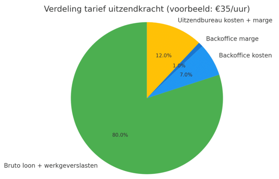 Niels Keizer 25 september 2025 0 reacties Print Wat kost een uitzendkracht en wat verdient een uitzendbureau?Wist je dat van elk uur dat je 35 euro betaalt voor een uitzendkracht, er ruim 28 euro direct naar loon en verplichte lasten gaat? Slechts een fractie blijft over als marge voor het uitzendbureau. In dit artikel legt Niels Keizer van One People Services stap voor stap uit hoe dat werkt. Veel mensen vragen zich af: wat kost een uitzendkracht eigenlijk? En hoeveel verdient een uitzendbureau daaraan? Het beeld leeft vaak dat bureaus enorme winsten maken. Een uitzendkracht denkt soms: “Ik verdien 16 euro bruto per uur, maar mijn opdrachtgever betaalt 35 euro. Dat verschil van 19 euro is pure winst.” Zo werkt het niet. Het verschil tussen loon en tarief bestaat grotendeels uit werkgeverslasten, reserveringen en risico’s die het bureau of de backoffice moet afdekken. In dit artikel leggen we stap voor stap uit hoe de kosten zijn opgebouwd, welke rol de backoffice speelt en hoe de verdeling van marges in werkelijkheid eruitziet. Wat doet een uitzendbureau? Een uitzendbureau koppelt werkgevers en werknemers. Hun kerntaak is om snel de juiste match te maken: de juiste kandidaat op de juiste plek. Daarbij hoort werving en selectie, begeleiding van de flexwerker en het onderhouden van klantcontact. Een intermediair wil zich juist dáárop richten, en niet op complexe arbeidsvraagstukken of cao-regels. Daarom besteden de meeste bureaus hun backoffice uit. Waarom werken uitzendbureaus met een backoffice? Alleen de grootste spelers, zoals Randstad en Adecco, hebben een eigen backoffice. Voor kleine en middelgrote bureaus is dat simpelweg te kostbaar en risicovol. Een backoffice neemt het volledige werkgeverschap en de administratieve last over. Dat gaat veel verder dan alleen loonstroken draaien: Contracten en salarisadministratie Voorfinanciering: salarissen worden wekelijks betaald, facturen vaak pas na 14 tot 30 dagen ontvangen Risico’s: loondoorbetaling bij ziekte, debiteuren die failliet gaan, juridische aansprakelijkheid en zelfs boetes bij fouten (ABU, SNCU, NEN) Software: complexe en kostbare systemen die continu up-to-date moeten zijn met veranderende wetgeving Certificering en audits: controles zijn streng, fouten kunnen leiden tot boetes en claims Personeel: ervaren backoffice-medewerkers die dossiers kennen en snel schakelen Kortom: een uitzendbureau kan zich niet veroorloven om dit zelf te doen zonder enorme investeringen en risico’s. Voorbeeld van een betrouwbare backoffice partner Veel bureaus kiezen er daarom voor hun backoffice uit te besteden. One People Services staat al meer dan vijftien jaar midden in de markt, is ABU-gecertificeerd en financieel solide. Dat betekent dat alle risico’s – van loondoorbetaling bij ziekte tot debiteurenbeheer, voorfinanciering en juridische aansprakelijkheid – veilig zijn afgedekt. Belangrijk voor opdrachtgevers: als een backoffice omvalt, kan de Belastingdienst onbetaalde premies en belastingen alsnog verhalen op de opdrachtgever. Een financieel betrouwbare backoffice is dus cruciaal, niet alleen voor het uitzendbureau, maar ook voor de klant. De kosten van een uitzendkracht: van loon naar tarief Stel dat een opdrachtgever 35 euro per uur betaalt voor een uitzendkracht die 16 euro bruto per uur verdient. Hoe is dat bedrag opgebouwd? Kostencomponenten Bruto uurloon Vakantiegeld en vakantiedagen (reserveringen) Sociale premies en werkgeverslasten (WW, ZW, WIA, pensioenpremies en verzekeringen) Pensioenpremie Ziekte- en verzuimrisico, inclusief re-integratie Debiteurenrisico (wanbetalers of failliete klanten) Boetes en juridische aansprakelijkheid bij fouten of overtredingen Backofficekosten (personeel, huisvesting, software, certificering, audits enz.) Wervings- en begeleidingskosten van het uitzendbureau zelf Marge voor zowel uitzendbureau als backoffice Rekenvoorbeeld: tarief van 35 euro per uur Component Bedrag (€/uur) % van totaal Bruto loon + werkgeverslasten 28,00 80% Kosten backoffice (incl. marge) 2,80 8% Overige kosten + marge uitzendbureau 4,20 12% Totaal 35,00 100% Wat betekent dit? Van de 35 euro gaat ruim 80% direct naar de werknemer en de verplichte werkgeverslasten, inclusief pensioen. Ongeveer 8% gaat naar de backoffice, waarvan slechts ±1% marge is. De rest zijn echte kosten voor voorfinanciering, software, audits, risico, verzekeringen, personeel en kantoor. De laatste 12% is voor het uitzendbureau zelf: werving, selectie, begeleiding, kantoor, personeel en een kleine marge. Visualisatie: verdeling van kosten Benieuwd hoe dit er voor jouw organisatie uitziet? One People Services laat graag zien hoe de kosten en risico’s in jouw situatie verdeeld zijn. Zo weet je precies waar je aan toe bent. Neem vrijblijvend contact op Mythe doorbroken: is uitzenden een goudmijn? De perceptie dat een bureau enorme winsten maakt, klopt niet. Het verschil tussen bruto-uurloon en tarief is geen winst, maar een optelsom van lasten en risico’s. De realiteit: marges zijn klein en afhankelijk van: De functie: werving van een schoonmaker kost minder dan van een AI-programmeur De sector: premies en cao’s verschillen De schaarste op de arbeidsmarkt De contractvorm (fase A, B of C) Het ziekteverzuim en debiteurenrisico Wie transparant naar deze kosten kijkt, ziet dat uitzenden geen goudmijn is, maar een dienst met hoge verantwoordelijkheid. Waarom is uitzenden aantrekkelijk voor opdrachtgevers? Ondanks de kostenstructuur is uitzenden nog steeds een aantrekkelijke oplossing. Snelheid: bureaus kunnen vaak razendsnel geschikte mensen leveren. Flexibiliteit: perfect voor pieken, ziekte en tijdelijke projecten. Proefperiode: vaak neemt een opdrachtgever een uitzendkracht na een aantal uur in vaste dienst. Zo leer je iemand echt kennen voordat je een contract aanbiedt. Risico-afdekking: werkgeversrisico’s liggen bij het uitzendbureau en de backoffice, niet bij de opdrachtgever. Conclusie: helderheid voorkomt misverstanden Een tarief 