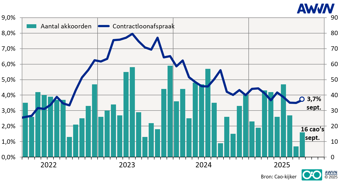 Redactie FlexNieuws 16 oktober 2025 0 reacties Print AWVN: Loonafspraken nog steeds ruim boven 3 procentDe gemiddelde loonafspraak in nieuwe cao’s bedroeg in september 3,7 procent. Dat is opnieuw lager dan het jaargemiddelde van 4 procent tot dusver over 2025, maar niet de verwachte sterke daling ten opzichte van eerdere maanden.In september bedroeg de gemiddelde loonafspraak 3,7 procent. Dat meldt AWVN als arbeidsvoorwaardenadviseur van Nederlandse werkgevers in haar cao-maandbericht over september. De september-cao’s gelden voor 84.000 werknemers. Afgelopen maand werden 16 cao’s afgesloten, een normaal aantal. Ook het totale aantal cao’s dat tot dusver dit jaar werd afgesloten is normaal. Sinds het hoogste maandgemiddelde van 8 procent in juni 2023 daalden de loonafspraken in cao’s. De 3,7 procent van april was het eerste maandgemiddelde in ruim tweeënhalf jaar dat onder de 4 procent uitkwam. Sindsdien stagneert de daling en komen maandgemiddelden uit op waarden net onder de 4 procent. Het september-gemiddelde past in dit beeld. Het gemiddelde over 2025 ligt na 9 maanden op 4 procent. Vestigingsklimaat onder druk In haar duiding van het september-cijfer stelt AWVN zich grote zorgen te maken over de ontwikkeling van de lonen en de loonkosten. De economische en politieke consensus is inmiddels dat het vestigingsklimaat van Nederland zwaar onder druk staat. Bedrijfssluitingen en reorganisaties in vooral de industrie tonen dat aan. Hogere loonkosten door hoge loonafspraken zullen op lange termijn het concurrentievermogen verder uithollen en investeringsbeslissingen in het nadeel van Nederland doen uitvallen, waarschuwt de werkgeversvereniging. De huidige hoge loonafspraken zullen daardoor op termijn nadelig blijken voor veel werknemers, verwacht AWVN. Daarbij is volgens de werkgevers het vakbondsargument verdwenen dat inflatie met hoge loonafspraken gecompenseerd moet worden. CBS-cijfers wijzen uit dat vooral werkenden er de afgelopen tijd sterk in koopkracht op vooruit zijn gegaan. De Rijksbegroting voor 2026 en doorrekening van verkiezingsprogramma’s door het Centraal Planbureau maken het aannemelijk dat de komende tijd de koopkracht van burgers verder zal verbeteren. Het AWVN-looncijfer geeft aan wat werknemers die onder de betreffende cao’s vallen in de komende 12 maanden aan loonsverhogingen kunnen verwachten. De periodieke cao-cijfers van het CBS kijken terug op de realisatie van de gemaakte cao-afspraken. Kerncijfers Loonafspraken september, gemiddeld 3,7% Loonafspraken kalenderjaar 2025, gemiddeld 4,0% Loonafspraken kalenderjaar 2024, gemiddeld 4,9% Hoogste maandgemiddelde afgelopen jaren 8,0% in september 2023 Laagste maandgemiddelde afgelopen jaren 1,6% in oktober 2020 Aantal nieuwe cao-akkoorden in september 2025 16 voor 84.000 werknemers Gemiddeld aantal nieuwe cao-akkoorden in maand september 21 Aantal aflopende cao’s in 2025 454 voor 2,9 mln. werknemers Aantal vernieuwde cao’s die in 2025 ingaan 329 voor 2,5 mln. werknemers Aantal openstaande cao’s op dit moment (expiratie in 2025) 125 voor 420.000 werknemers Het cao-seizoen in één oogopslag Aantal afgesloten akkoorden en gemiddelde afgesproken cao-loonstijging per afsluitmaand (exclusief incidentele loonsverhogingen). Lees ook: AWVN: Loonafspraken augustus iets lager AWVN, cao, loon, loonafspraken Print Over de auteur Over Redactie FlexNieuws Redactie van Flexnieuws - interviews, artikelen, aankondigingen en persberichten. Bekijk alle berichten van Redactie FlexNieuws
