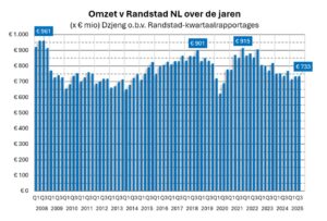 Wim Davidse 22 oktober 2025 0 reacties Print Randstad Nederland krimpt toch weer iets meer in Q3Met zes procent omzetkrimp in het derde kwartaal ging het toch weer wat minder met de Randstad-groep in Nederland, ziet Wim Davidse. Met een opvallende constatering over het personeelsbestand, na een stevige krimp in Nederland in 2024 en de sterke vertraging daarvan in de eerste helft van dit jaar.De wereldwijde omzet van de Randstad-groep is in het derde kwartaal met -1% gekrompen (organisch, dus gecorrigeerd voor overnames, wisselkoersverschillen en werkbare dagen) naar 5,8 miljard euro. Daarmee boekte de groep wat minder omzetkrimp dan de -2% in het tweede kwartaal. Cumulatief is de mondiale omzetkrimp nu -3%. Eerder maakte ManpowerGroup een mondiale omzetstijging in Q3 bekend (+1%); desondanks is die groep met een totale wereldwijde omzet van omgerekend 3,9 miljard euro in Q3 nog een heel stuk kleiner. De Randstad-specialisatie Operational was in het derde kwartaal goed voor 67% van de totale concern-omzet, Professional voor 16%, Digital voor 11% en Enterprise voor 6%. Professional boekte in Q3 met -7% veruit de grootste omzetdaling, Digital deed -2%, Operational stabiliseerde en de Enterprise-omzet groeide met +2%. De bruto-marge werd -5% kleiner, waardoor die als percentage van de omzet zakte van 19,5% naar 18,4%. Net als in het vorige kwartaal behoort dat percentage tot de laagste van de groep in de afgelopen 10 jaar. De onderliggende EBITA-marge kwam in het derde kwartaal uit op 3,3% van de omzet (EBITA = earnings before interest, taxes, and amoritzation – ofwel de winst voor aftrek van rentekosten, belastingen en afschrijving op goodwill in overnames.) CEO Sander van ‘t Noordende over het derde kwartaal: “Onze ‘Partner for Talent’-strategie, met de focus op excellente dienstverlening en een digitale aanpak als prioriteit, in combinatie met een sterke kostenbeheersing, heeft in het afgelopen kwartaal geleid tot aanzienlijke operationele vooruitgang en een solide set resultaten. We zagen een goede verbetering in onze Operational- en Enterprise-specialisaties en hebben de uitrol van onze Torc digitale marktplaats voor Randstad Digital in de VS voltooid. Randstad genereert nu wereldwijd ongeveer € 4 miljard aan jaarlijkse omzet via onze digitale marktplaatsen, wat neerkomt op 15% van de totale omzet. “In september vierden we het 65-jarig bestaan van Randstad – een mijlpaal die de sterke geschiedenis en cultuur van het bedrijf onderstreept. Ik ben ontzettend trots op de uitzonderlijke bijdrage die onze teams in de loop der decennia hebben geleverd aan de wereld van werk. We zijn gemotiveerder dan ooit om het meest rechtvaardige en gespecialiseerde talentbedrijf ter wereld te worden.” [ cursivering door de FlexNieuws-redactie ] De aandelenbeurs reageerde diep teleurgesteld: in de loop van de middag stond het aandeel Randstad (RAND.AS) een dikke -7% in de min, de AEX stond tegelijkertijd op een klein plusje van +0,2%. Duitsland en Frankrijk stevig gekrompen, Noord-Amerika stabiel, groei in Asia-Pacific In Noord-Amerika, goed voor bijna 19% van de mondiale concern-omzet, stabiliseerde de omzet van Randstad. De winst (EBITA) groeide er met +9%, naar een winstmarge van 4,6%. De omzet in Noord-Europa (goed voor 32%) werd -4% kleiner, de winst zelfs -14%, naar een winstmarge van 3,8%. Zuid-Europa (plus Groot-Brittannië en Latijns-Amerika) is met 39% de grootste Randstad-regio en zag de omzet nog maar -1% kleiner worden. De winst kromp er met -5%, naar een winstmarge van 4,3%. De kleinste Randstad-regio tot slot is nog steeds Asia-Pacific, goed voor bijna 10% van de totale omzet; daar groeide de omzet organisch weer met +2%; de winst werd er echter -7% kleiner, naar een winstmarge van 4,3%. In Noord-Europa was het ook dit kwartaal weer Duitsland dat met -7% de sterkste omzetdaling te verwerken kreeg. Randstad maakte er dit kwartaal echter weer winst, al was dat met een EBITA-marge van 1,7% bescheiden. Ook Frankrijk (in de regio Zuid-Europa, en goed voor bijna 14% van de groepsomzet) realiseerde een omzetkrimp, nu van -4%; de winst werd er ook -4% kleiner en de EBITA-marge bleef 4,0%. Nederland blijft gemêleerd en eerder voorzichtig herstel zet niet door Nederland is qua omzet het grootste land in de regio Noord-Europa, en nog steeds goed voor bijna 13% van de omzet van het totale Randstad-concern. De Randstad-omzet werd in ons land -6% kleiner, en ging naar 733 miljoen euro (dezelfde omzet als in Q2). In het tweede kwartaal van dit jaar was de omzetkrimp nog -5%; cumulatief is de Nederlandse omzet dit jaar -6% gekrompen. Wel frappant: de omzet in het derde kwartaal was net zo groot als die in het tweede kwartaal; dat hebben we sinds corona niet meer gezien, de Q3-omzet was steeds kleiner dan de Q2-omzet. De Nederlandse Operational-omzet (vooral grootschalig uitzenden) kromp met -4% (-3% in Q2), de Professional-omzet (detachering) met een enorme -18% (-15% in Q1). De winst bleef gelijk, en kwam uit op een winstmarge van 5,2%. Eind vorige week rapporteerde ManpowerGroup Nederland een omzetkrimp van -4%, eind september meldde de ABU een voorlopige groei van de kwartaalomzet in de ABU Marktmonitor van +0,9%. Tot slot nog een opvallende constatering: na de stevige krimp van het personeelsbestand in Nederland in 2024 en de sterke vertraging daarvan in de eerste helft van dit jaar, is het bestand met eigen medewerkers in Q3 met een kwart procent gegroeid ten opzichte van een jaar eerder. Verwachtingen In de outlook stelt Randstad geen veranderingen in de omzetontwikkeling te zien, maar wel licht verbeterde marges. De komende weken verschijnen nog de september-cijfers van de ABU Marktmonitor en ook de kwartaalcijfers van Brunel, Adecco Group, de VvDN en de totale flexbranche. Dan gaan we vooral zien wat de enorme krimp van de Professional-omzet waard is. Stay tuned! cijfers, Manpower, omzet, personeelsbestand, randstad, uitzendbranche Print Over de auteur Over Wim Davidse Wim Davidse i
