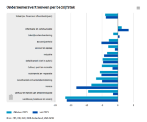 Redactie FlexNieuws 6 november 2025 0 reacties Print CBS-cijfers: winst zakt, maar ondernemers willen in 2026 weer investerenOndernemers verwachten in 2026 meer te investeren, ondanks een dalende winstgevendheid en aanhoudend negatief vertrouwen. Vooral in de vastgoedsector en bouw blijven de investeringsplannen opvallend positief. 33 procent van de ondernemers voert een tekort aan arbeidskrachten aan als belangrijkste belemmering in hun bedrijfsvoering.Dat meldt het Centraal Bureau voor de Statistiek (CBS) in een nieuw onderzoek. Het onderzoek, dat samen met het KVK, het Economisch Instituut voor de Bouw (EIB), MKB-Nederland en VNO-NCW tot stand kwam, laat echter ook zien dat de winstgevendheid van bedrijven het afgelopen kwartaal verder is afgenomen en dat het ondernemersvertrouwen negatief blijft. Per saldo verwacht ruim 3 procent van de ondernemers meer te investeren in 2026. Vooral ondernemers in de vastgoedsector zijn optimistisch: daar verwacht per saldo 25 procent meer te investeren. Negen bedrijfstakken verwachten meer te investeren, de overige drie bedrijfstakken verwachten minder te investeren. In de cultuur, sport en recreatie en in de detailhandel verwachten ondernemers meer te investeren, terwijl ze vorig jaar nog een afname verwachtten. In de landbouw, bosbouw en visserij, in de horeca en de informatie en communicatie, verwachten ondernemers dat ze minder gaan investeren in 2026. Lees ook: HR-professionals bevragen politici over arbeidsmarktplannen: ‘Wie gaat het werk doen?’ Afname winstgevendheid Aan het begin van het vierde kwartaal van dit jaar gaven meer ondernemers aan dat hun winstgevendheid is afgenomen dan toegenomen in het afgelopen kwartaal; het saldo was daarmee negatief. In acht van de twaalf bedrijfstakken zijn ondernemers negatiever over de winstgevendheid. Doordat ondernemers in de bouwnijverheid positiever zijn over hun winstgevendheid, is het totaalcijfer vrijwel hetzelfde als vorig jaar. Verder waren alleen in de groothandel, de industrie en de vastgoedsector ondernemers minder negatief dan een jaar geleden. In de autohandel en -reparatie waren ondernemers met een saldo van -21 procent het negatiefst over de ontwikkeling van hun winstgevendheid. Ondernemersvertrouwen blijft negatief Het ondernemersvertrouwen komt in het vierde kwartaal van 2025 uit op -4,0 en blijft daarmee vrijwel gelijk ten opzichte van een kwartaal eerder. Ondernemers waren negatiever over het economisch klimaat in het afgelopen kwartaal, dan over hun verwachtingen voor het komende kwartaal. Het ondernemersvertrouwen is sinds begin 2022 onafgebroken negatief en ligt op het gemiddelde (-4,0) sinds 2012. Lees ook: Ondernemersvertrouwen zakelijke dienstverlening van negatief naar positief Positief ondernemersvertrouwen in de informatie en communicatie In de informatie en communicatie is het ondernemersvertrouwen als enige bedrijfstak nog positief. In alle andere bedrijfstakken is de stemmingsindicator negatief, en in de meeste bedrijfstakken ook iets negatiever dan vorig kwartaal. In de verhuur en handel van onroerend goed is de stemming het sterkst gedaald. In de zakelijke dienstverlening is het cijfer omgeslagen van positief naar negatief. In de horeca is het vertrouwen het sterkst verbeterd, maar nog steeds negatief. Ondernemers in de landbouw, bosbouw en visserij zijn het negatiefst gestemd. Tekort aan arbeidskrachten Aan het begin van het vierde kwartaal van 2025 gaf 33 procent van de ondernemers een tekort aan arbeidskrachten aan als belangrijkste belemmering in hun bedrijfsvoering. Dit is sinds het derde kwartaal van 2021 de meest genoemde belemmering. Daarnaast zei 22 procent dat onvoldoende vraag de belangrijkste belemmering was. Ruim 10 procent van de ondernemers noemde financiële beperkingen. Ruim 33 procent zei geen belemmeringen te ervaren. Lees ook: Arbeidsmarkt minder krap, maar tekort aan personeel blijft in veel sectoren arbeidsmarktkrapte, CBS, cijfers Print Over de auteur Over Redactie FlexNieuws Redactie van Flexnieuws - interviews, artikelen, aankondigingen en persberichten. Bekijk alle berichten van Redactie FlexNieuws