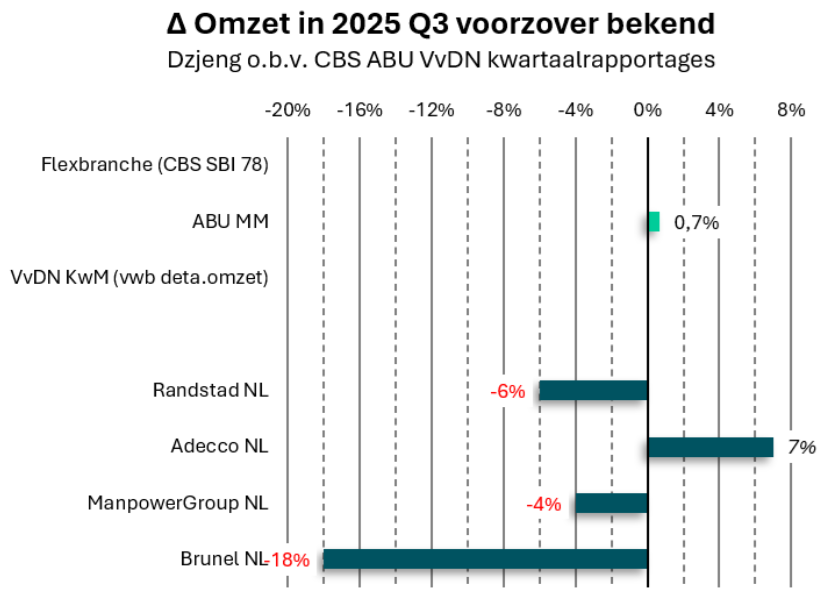 Adecco blijft in 2025 de enige beursgenoteerde flex-groep met stevige omzetgroei in de Benelux. Brunel Nederland is in het derde kwartaal in een vrije val terecht gekomen. De brutomarge bleef stabiel, maar de omzet kelderde.