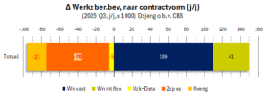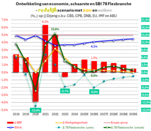 Wim Davidse 18 december 2025 0 reacties Print De flexbranche in en na 2026De flexbranche staat in 2026 voor grote veranderingen: nieuwe cao’s voor uitzendkrachten en gedetacheerden, krapte op de arbeidsmarkt, toenemende interne flex en omzetverschillen tussen segmenten. Flexbureaus moeten kiezen voor toegevoegde waarde om future proof te blijven.Terwijl de economie in 2025 nog wat meer aantrok, koelde de arbeidsmarkt juist wat verder af. De flexbranche zag de omzet ongeveer stabiliseren en de uren nog een beetje krimpen. De verschillen tussen flexsegmenten waren ook dit jaar weer aanzienlijk. Voor 2026 wordt iets minder economische groei voorspeld, met wederom veel onzekerheden en turbulentie. En de wetgever houdt zich ook in 2026 niet rustig. Maar de allergrootste onruststokers zijn natuurlijk de nieuwe cao’s voor uitzendkrachten en die voor gedetacheerden. Wat zal 2026 de flexbranche brengen? Beter dan voorspeld Een jaar geleden verwachtte ik dat in 2025 de economie 1,5 procent zou groeien, de werkgelegenheid zou stabiliseren en de werkloosheid iets zou oplopen, naar 4,2 procent. De flexbranche-uren zouden met 3,0 procent krimpen en de omzet met 3,5 procent groeien. De feiten zien er nu wat beter uit: de economie zal dit jaar met ongeveer 1,7 procent groeien, de werkgelegenheid zal circa 0,4 procent groeien en de werkloosheid zal op 3,9 procent uitkomen. De flexbranche-uren zullen ongeveer 1 procent krimpen en de omzet (de enige tegenvaller ten opzichte van mijn voorspellingen van vorig jaar) zal stabiliseren. Vast is in, en dat is logisch (en lastig) Was die relatieve uren-meevaller voor de flexbranche te danken aan de op 1 januari j.l. gestarte handhaving van de Wet DBA? Dat zzp’ers hun heil gingen zoeken in een uitzend- of detacheringscontract? Daar lijkt het zeker niet op. Dat die start gepaard ging met krimpende uren voor de flexbranche zegt eigenlijk al genoeg. Het zijn vooral de vaste contracten die hebben geprofiteerd: in de eerste drie kwartalen van 2025 (tot zover gaan de nu beschikbare data) groeide hun aantal met 1,8 procent, aanzienlijk harder dus dan de totale werkgelegenheid. En dat is logisch: op een krappe arbeidsmarkt, met een werkloosheid onder de 5 procent, willen werkgevers ‘hun’ mensen binden en bieden daarom vaker en eerder contracten voor onbepaalde tijd aan. De grafiek maakt die dans van economie, arbeidsmarkt, vaste contracten en uren van externe inhuur duidelijk. Op een krappe arbeidsmarkt heeft de flexbranche het altijd moeilijk. Ook interne flex blaast een partij mee De start van de handhaving van de Wet DBA had duidelijk invloed op het aantal zzp’ers (eigen arbeid): dat daalde. Omdat organisaties in deze onduidelijke, roerige tijden een wendbaar personeelsbestand belangrijk vinden, en met het oog op de krapte die flexibele mensen toch zo dichtbij mogelijk willen houden, gingen ze in 2025 de flexibiliteit meer intern regelen: ze maakten meer gebruik van tijdelijke contracten en oproepkrachten. In de onderstaande grafiek is dat voor wat betreft het derde kwartaal goed zichtbaar. Als wat dieper wordt ingezoomd op de economie en de arbeidsmarkt, blijkt dat de verschillen tussen de bedrijfstakken (branches, sectoren) enorm zijn. Zo groeide de werkgelegenheid in de Zorg en de Industrie, en kromp die in de Zakelijke dienstverlening en in het Onderwijs. In de Zorg verdwenen er flink wat zzp’ers (eigen arbeid) en groeide het aantal vaste contracten, de interne flex én het aantal uitzendkrachten en gedetacheerden. Het aantal uitzendkrachten en/of gedetacheerden groeide in het derde kwartaal alleen in de Zorg, Logistiek, Verhuur van onroerend goed en Specialistische zakelijke diensten. In de Industrie was dat hetzelfde als in de Zorg, met uitzondering van een krimpend aantal uitzendkrachten en gedetacheerden. In het Onderwijs namen alle flexvormen af en groeide alleen het aantal vaste medewerkers. Bijna elke sector heeft een andere groei- of krimpmix. Hoe dan ook, de flexbranche heeft met 2025 weer een moeilijk jaar achter de rug. Maar er was ook (omzet)groei in de flexbranche! Hoewel, de flexbranche… natuurlijk waren er ook dit jaar weer grote groei- en krimpverschillen zichtbaar. In onze TOP 100 werd weer heel duidelijk hoe groot die verschillen zijn tussen flexbureaus. En ook dat die sterk samenhangen met strategische keuzes en met de interne cultuur; dus grofweg met de keuzes voor wel of niet specialiseren en welke specialisaties dan. Maar ook met een ondernemende en decentrale cultuur of een bureaucratische en gecentraliseerde cultuur. Ook in de loop van 2025 zagen we weer krimpers én groeiers. Na twee kwartalen met omzetkrimp voor de flexbranche als geheel, was er in het derde kwartaal alweer wat omzetgroei: +0,9 procent ten opzichte van een jaar eerder. Onder dat rustige oppervlak waren de verschillen enorm, met opvallend genoeg veel krimp bij detachering. Uit al die cijfers kan ook nog worden afgeleid dat de duizenden bureaus die hun cijfers niet elk kwartaal publiceren, in het derde kwartaal samen 1,5 procent omzetgroei hebben gerealiseerd. In het tweede kwartaal was dat nog 0,5 procent krimp, in het eerste nog het dubbele daarvan. De nieuwe cao’s, de Wmzf en de Wtta Op ons eerste FlexNieuws LIVE event, op 20 mei 2025, spraken we met directeuren van drie hard groeiende bureaus over hun bijzondere strategische keuzes en dito cultuur. Daar presenteerden we vervolgens de uitkomsten van ons eind april-begin mei uitgevoerde lezersonderzoek. Daaruit bleek onder meer dat flexondernemers de (krappe, complexe) arbeidsmarkt de op één na grootste uitdaging vinden om succesvol te zijn en blijven. Veruit de allergrootste uitdaging betrof volgens de deelnemers aan ons onderzoek: de wet- en regelgeving. Wel, daar moeten we ons in 2026 misschien wel meer dan ooit mee bezig houden. De nieuwe cao’s voor uitzendkrachten en voor gedetacheerden hebben onze sector al flink wat overuren laten draaien in de voorbereiding, en de uitvoering ervan vanaf 1 janua