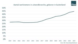 Sinds 2010 is het aandeel buitenlandse werknemers in de uitzendbranche met meer dan de helft toegenomen. Toen vervulden zij nog 27,2 procent van de banen. Ter vergelijking: in de totale Nederlandse economie steeg dit aandeel in dezelfde periode van 8,5 procent naar 14,3 procent.