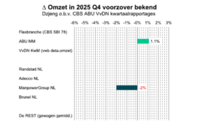 Wim Davidse 30 januari 2026 0 reacties Print ManpowerGroup Nederland krimpt nog wat in Q4ManpowerGroup blijft krimpen in Nederland, maar in het vierde kwartaal minder dan eerder in 2025. Wel meer dan de ABU Marktmonitor, maar de trend lijkt goed. Voorlopig ziet de groep de prestaties niet serieus verbeteren, en de al lage bruto marges verder dalen.ManpowerGroup blijft krimpen in Nederland, maar in het vierde kwartaal minder dan eerder in 2025. Wel meer dan de ABU Marktmonitor, maar de trend lijkt goed. Voorlopig ziet de groep de prestaties niet serieus verbeteren, en de al lage bruto marges verder dalen. Na de Page-cijfers zijn dit de eerste staffing kwartaalcijfers die vooral over uitzenden gaan – traditiegetrouw van ManpowerGroup. Donderdagmiddag publiceerde de groep een omzetkrimp van -2% in Nederland in het vierde kwartaal, iets beter dan de -4% in het derde kwartaal, waarmee de totale jaarkrimp op zo’n -4% is uitgekomen (in 2024 nog -2,5%). De ABU Marktmonitor had al een omzetgroei van +1,1% in het laatste kwartaal van vorig jaar laten zien, en van +0,3% in het hele jaar. Beleggers reageren euforisch De wereldwijde omzet van ManpowerGroup groeide in het vierde kwartaal met +2% ten opzichte van vorig jaar, naar 4,7 miljard US dollar, ofwel zo’n 3,9 miljard euro (na correctie voor werkbare dagen, eventuele overnames en wisselkoersverschillen). Daarmee kwam de totale jaaromzet uit op 18,0 miljard US dollar (15,1 miljard euro) na een omzetstabilisatie ten opzichte van 2024. Dat is de beste jaar-ontwikkeling sinds 2021, toen de mondiale omzet van de groep met een flinke groei van +15% uit de coronacrisis oprees. De brutomarge van het totale concern zakte in 2025 naar 16,7% van de omzet (17,2% in 2024) en de winstmarge (voor rente, belastingen en afschrijvingen) daalde naar een lage 1,9% van de omzet (2,1% in 2024). De aandelenbeurs reageerde euforisch, en zette het aandeel ManpowerGroup (MAN) aan het einde van de handelsdag dik +16% hoger (nog altijd ruim -44% lager dan een jaar geleden), terwijl de beurs (S&P 500) op een klein minnetje van ongeveer -0,5% eindigde (ruim +9% ten opzichte van een jaar eerder). Lees ook: ManpowerGroup Nederland in Q3 niet minder gekrompen Omzetgroei en daling margepercentage in uitzenden … Binnen de ManpowerGroup was er weer wat meer groei bij Manpower (de operating unit die zich richt op uitzenden): +5%, dat was in het derde kwartaal nog +3%. Experis (professionals) kromp een tikkeltje minder dan in het derde kwartaal: -6% tegen -7%, Talent Solutions (RPO, MSP en Talentontwikkeling) halveerde de omzetkrimp: -4% tegen -8% in het voorgaande kwartaal. Manpower is ook in termen van bruto marge de belangrijkste business line en was in Q4 goed voor 62% van de totale bruto marge, na een groei van +1% – de omzet van deze business line groeide dus harder dan de bruto marge, dus hier een dalend margepercentage. Experis leverde -5% in en produceerde nog 22% van de totale bruto marge; en Talent Solutions leverde nog 16% van de totale bruto marge, na een stevige krimp in het vierde kwartaal van -11% ten opzichte van een jaar eerder. … en ook omzetgroei in bijna alle regio’s ManpowerGroup America levert 24% van de totale groepsomzet en groeide +5% in het vierde kwartaal, terwijl dat in het derde kwartaal nog een omzetkrimp van -1% was. De winstgevendheid van deze regio (de Operating Unit Profit Margin, de OUP margin) kwam uit op 3,4% van de omzet, dus binnen de groep relatief hoog. ManpowerGroup Zuid-Europa is met 48% van de totale mondiale omzet veruit de belangrijkste regio voor de groep. Daarbinnen is Frankrijk met 52% van de regio-omzet (dus 25% van de hele groep) van enorm belang voor het concern. In Frankrijk daalde de omzet van ManpowerGroup met -3% (dat was nog -7% in het kwartaal daarvoor), in Zwitserland was er omzetgroei van +2%, na de stevige -15% in Q3. In Spanje groeide de omzet met een forse +12% (+3% in Q3). In de totale regio groeide de omzet met +1% (was -1% in Q3). Ook daar dus een verbetering van de omzet-situatie. De winstgevendheid van deze regio (de OUP margin) kwam hier ook uit op 3,4% van de omzet. De omzet in de regio APME (Asia Pacific Middle East, 11% van de groepsomzet) groeide met +6% in Q4. Noord-Europa nog enige regio met omzetkrimp ManpowerGroup Noord-Europa (nog goed voor 17% van de omzet van de totale groep) zag de omzet als enige regio nog krimpen, maar met -1% nog maar een beetje (-6% in het vorige kwartaal, nog -10% in Q2 en zelfs -14% in Q1). Het Verenigd Koninkrijk zag de omzet nog maar met -3% krimpen, na kwartalen met krimpcijfers tot -22%. Duitsland ging op dezelfde slechte voet door: -22%, dezelfde sterke krimp als in de voorgaande kwartalen. De omzet van de groep in Nederland (zo’n 2% van de totale groep) kromp zoals gezegd met -2%. Scandinavië zag weer een bescheiden omzetgroei (+3%). De winstgevendheid van deze regio is in het laatste kwartaal van 2025 negatief gebleven (-1 miljoen dollar) maar as adjusted (na correctie voor herstructureringskosten van 5,9 miljoen dollar) uitgekomen op +5 miljoen winst; dat resulteerde in een uiterst lage OUP margin van -0,1% resp. 0,6%. Weinig serieus herstel voorzien, wel lagere bruto marges De omzet-outlook van het ManpowerGroup-concern in het eerste kwartaal van 2026 is niet wezenlijk anders dan de realisatie in het vierde kwartaal van 2025: -1 tot +3% ten opzichte van een jaar eerder. Voor Noord-Europa is de verwachting gezet op ergens tussen de -5 en -1%, dus stabilisatie of zelfs verslechtering ten opzichte van de ontwikkeling in het laatste kwartaal van 2025. De verwachte totale bruto marge is 16,2 tot 16,4%, dat is een heel procentpunt lager dan een jaar geleden. De verwachte EBITA is 1,3-1,5%, 0,1 procentpunt onder de verwachting van een jaar geleden. kwartaalcijfers, ManpowerGroup Nederland, Wim Davidse Print Over de auteur Over Wim Davidse Wim Davidse is director Trends & Insights bij ZiPmedia, hoofdredacteur van FlexNieuws en toekomstverteller en strategisch pr