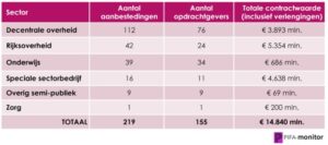 Gastblogger 22 januari 2026 0 reacties Print Publieke inkoop flexibele arbeid stijgt naar bijna €15 miljard in 2025De publieke inkoop van flexibele arbeid is in 2025 bijna verdubbeld naar 14,84 miljard euro. Vooral broker-/MSP-diensten en detachering groeien sterk. Dat concludeert Rémon van Buuren op basis van een analyse van de cijfers uit de PIFA-monitor.In 2025 is de inkoop van flexibele arbeid via openbare aanbestedingen gestegen naar 14,84 miljard euro. Dat is bijna een verdubbeling ten opzichte van 2024, toen voor een totale contractwaarde van 7,68 miljard euro werd aanbesteed. De groei zit vooral in aanbestedingen voor broker- en MSP-diensten en detachering. Inkoop flexibele arbeid via aanbestedingen Organisaties in de (semi-)publieke sector moeten bij de inkoop van externe inhuur voldoen aan de aanbestedingsregels. In 2025 zijn op TenderNed 219 aanbestedingen voor externe inhuur gepubliceerd, goed voor een gezamenlijke contractwaarde van bijna 15 miljard euro. Dit bedrag geeft echter geen volledig beeld van de publieke inhuurmarkt. Aanbestedende diensten kopen namelijk ook veel in via onderhandse procedures en het dynamisch aankoopsysteem (DAS), waarvan de gegevens niet altijd openbaar of eenduidig beschikbaar zijn. De werkelijke omvang van de publieke inkoop van flexibele arbeid ligt daarom aanzienlijk hoger. Lees ook: Zo gaat het er aan toe op de aanbestedingsmarkt flexibele arbeid Omvang publieke inkoop per sector Het grootste aanbestedingsvolume komt van de Rijksoverheid (€5,35 miljard). Het hoogste aantal aanbestedingen (112) werd gepubliceerd door de decentrale overheid, voornamelijk gemeenten. In totaal waren 47 gemeenten vorig jaar actief op de aanbestedingsmarkt voor flexibele arbeid. Bij de speciale sectorbedrijven is het aanbestedingsvolume opvallend hoog (ruim €4,6 miljard) in verhouding tot het aantal aanbestedingen. Dit beeld wordt echter vertekend door vier grote trajecten voor broker-/MSP-diensten (Enexis, Schiphol, Vitens en ProRail), die samen 3,96 miljard euro vertegenwoordigen. Dat is ongeveer 85 procent van het totale volume in deze sector. Figuur 1: Inhuur ingekocht per sector aanbestedende dienst Let op: deze analyse betreft uitsluitend openbare aanbestedingen via raamovereenkomsten. Onderhandse procedures, eenmalige opdrachten en ingetrokken aanbestedingen zijn buiten beschouwing gelaten. Inkoop van uitzenddiensten stabiel De aanbestedingsmarkt voor de inhuur van uitzendkrachten bleef in 2025 grotendeels stabiel. Het aantal opdrachten daalde licht met 2 procent, terwijl de totale contractwaarde met 8 procent steeg. Dat duidt op hogere gemiddelde contractwaarden dan een jaar eerder. Opvallende grote aanbestedingen van meer dan 50 miljoen euro kwamen onder andere van de gemeenten Nijmegen (P&O Netwerk), Utrecht en Groningen, de NS Groep N.V., het UWV en diverse ministeries (IFAR). Lees ook: Cao-wijziging heeft grote impact op inkoop van uitzenddiensten Toename aanbestedingen detachering Het aantal aanbestedingen voor detachering steeg met 18 procent ten opzichte van 2024. De totale contractwaarde groeide zelfs met 54 procent, naar 3,41 miljard euro. Het grootste deel van deze waarde betreft contracten voor de detachering van ICT-profielen (€1,25 miljard) en juridische functies (€971 miljoen). Ruim de helft van de totale contractwaarde (€2,5 miljard) is ingekocht door de Rijksoverheid via 24 aanbestedingen door verschillende ministeries. Broker- en MSP-diensten verdubbeld De sterkste groei was zichtbaar bij de inkoop van broker- en MSP-diensten. Het aantal aanbestedingen nam in 2025 met 59 procent toe. De meeste aanbestedingen komen van gemeenten (16) en zelfstandige bestuursorganen (10). Opvallend is dat het aantal aanbestedingen voor broker- en MSP-diensten het afgelopen jaar dichter in de buurt kwam van het aantal aanbestedingen voor detachering. De totale contractwaarde die is aanbesteed voor inhuur via het marktmodel is meer dan verdubbeld ten opzichte van 2024 (+148%). Dit vraagt wel om nuancering: ongeveer 40 procent van deze waarde komt uit zeer grote contracten van meer dan 100 miljoen euro per jaar, onder andere van Enexis, de Politie en Schiphol. Ook de lange looptijd (tot acht jaar) en de brede scope van deze contracten dragen bij aan de hoge contractwaarde. Figuur 2: Inhuur ingekocht via openbare aanbestedingen gepubliceerd op TenderNed De cijfers in dit artikel zijn afkomstig uit de dashboards van de PIFA-monitor, een interactieve analysetool die inzicht biedt in de aanbestedingsmarkt voor flexibele arbeid. Meer informatie is te vinden op www.pifa-monitor.nl of op te vragen bij Rémon van Buuren. aanbesteding, externe-inhuur, PIFA-monitor, publieke sector Print Over de auteur Over Gastblogger Flexnieuws geeft ruimte aan auteurs die een artikel willen plaatsen op Flexnieuws. Bekijk alle berichten van Gastblogger