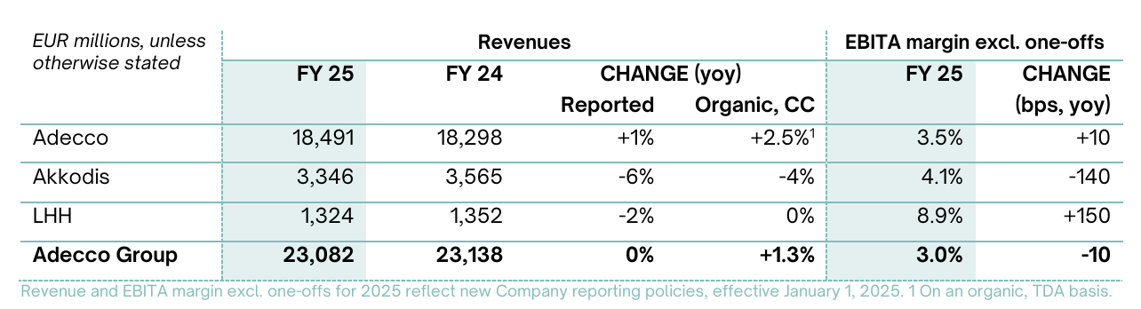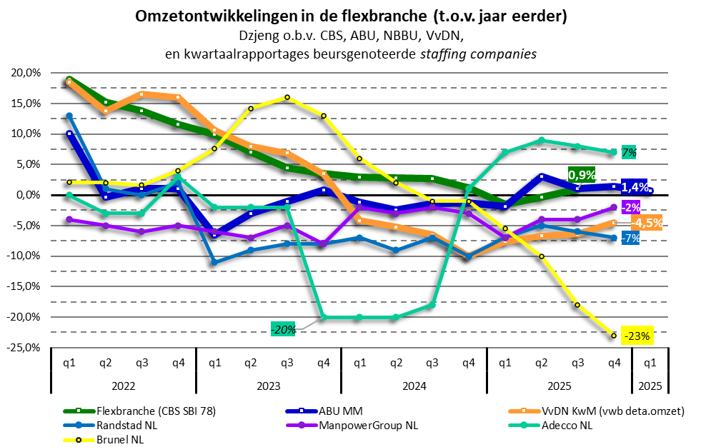 Wim Davidse 25 februari 2026 0 reacties Print Adecco Group groter dan Randstad in Q4, Nederlandse omzet groeit verderOver het vierde kwartaal van 2025 rapporteerde Adecco Group wereldwijd een mooie omzetgroei en is daarmee Randstad gepasseerd en nu de nummer 1 staffing company in termen van omzet. Over Nederland weer geen mededelingen, maar de omzet is weer verder gegroeid.Vanochtend publiceerde Adecco Group z’n cijfers over het vierde kwartaal: de mondiale omzet van de groep is +4% gegroeid (ten opzichte van een jaar eerder, na correctie voor werkbare dagen, eventuele overnames en wisselkoersverschillen). In het derde kwartaal was dat nog +3%. Eerder rapporteerden Randstad en ManpowerGroup een mondiale omzetkrimp van -2% respectievelijk een mondiale omzetgroei van +2% ten opzichte van het vierde kwartaal van een jaar eerder. De wereldwijde omzet van Adecco Group kwam in het laatste kwartaal van 2025 uit op 5,958 miljard euro, nu voor het eerst meer dan Randstad: +87 miljoen euro. De bruto marge zakte naar 19,1% van de omzet (was een jaar eerder nog 19,2%) en de winst voor rente, belastingen en goodwill-afschrijvingen (de EBITA) steeg naar 3,8% van de omzet (was 3,2%) – beide percentages lagen daarmee in Q4 hoger dan die van Randstad en de ManpowerGroup. Over het hele jaar was de omzet van Adecco Group wereldwijd 23,082 miljard euro, dus een groei van +1%. Randstad kwam na een jaarkrimp van -2% uit op een totale mondiale omzet van 23,077 miljard euro – in 2025 was de omzet van Adecco Group dankzij de sterke eindsprint in Q4 dus 5 miljoen euro groter dan die van Randstad, ofwel een miniem maar positief verschil van +0,02%. Lees ook: Omzet Adecco Nederland in Q3 weer gegroeid, Brunel NL in vrije val De Global Business Units en de Service Lines: versnelling in uitzenden De drie Global Business Units (GBU) van Adecco Group realiseerden de volgende omzetontwikkelingen. Adecco, goed voor 81% van de mondiale concernomzet en 68% van de EBITA, zag in het laatste kwartaal een omzetgroei van +5% (+2% voor het hele jaar). De omzetontwikkeling verschilde per Adecco-component: (vooral) grootschalig uitzenden +4%, outsourcing +14%, recruitment voor vast -6% en MSP +6%. De Adecco EBITA-marge kwam voor het hele jaar uit op 3,5% (3,4% in 2024). Akkodis (met name tech en IT professionals ten behoeve van innovatie en high tech transformatie) kromp met -1% (-4% in het hele jaar). De Akkodis EBITA-marge kwam voor het hele jaar uit op 4,1% (5,5% in 2024). Akkodis was daarmee in 2025 goed voor 14% van de groepsomzet en 15% van de groepswinst. LHH (dienstverlening ten behoeve van de workforce transformatie, met name interne en externe mobiliteit) zag de omzet met +2% groeien in het vierde kwartaal (stabilisatie in het hele jaar). Professional Recruitment Solutions (recruitment process outsourcing (RPO)) zag de omzet met -3% krimpen, Career Transition groeide (+1%) en Coaching & Skilling deed het met +27% omzetgroei heel erg goed. De LHH EBITA-marge kwam voor het hele jaar uit op een mooie 8,9% (7,4% in 2024). Adecco Group rapporteert ook over haar vijf Service Lines. De omzetgroei kwam in 2025 vooral van van Career Transition en Outsourcing & Consulting, de omzet van Training en van Permanent Placement werd daarentegen kleiner. De omzetgroei van Flexibel Placement, veruit de grootste Service Line met 75% van de groepsomzet, versnelde in Q4 naar +4%. Duitsland groeit alweer In Frankrijk (goed voor liefst 19% van de groepsomzet) kromp de Adecco-omzet nog met -2%, in de rest van de EMEA-regio (goed voor 39% van de groepsomzet) was er +4% omzetgroei. Dat was ondanks de UK & Ireland (-1% omzetkrimp). In andere EMEA-landen ging het stukken beter: in Spanje plus Portugal was er +7% omzetgroei, in de Nordics +6% en in de Benelux +5%. De omzetontwikkeling in Duitsland was opvallend en relatief sterk: +2% – een heel stuk beter dan de omzetontwikkeling daar van Randstad (-9%) en Brunel (-16%). Frankrijk heeft met 4,4% nog wel de hoogste EBITA-marge van de Adecco-unit. In Noord-Amerika ontplofte de Adecco-omzet met +23%, en in Latijns-Amerika ging het met +19% niet veel minder goed. De Americas zijn goed voor 13% van de groepsomzet. In de Asia-Pacific regio, waar de groep 10% van de omzet realiseert, groeide de omzet met +7%. Lees ook: Brunel Nederland in Q4 in omzet-afgrond gestort Adecco Nederland groeit lekker verder In de loop van 2024 hebben we in onze berichtgeving over Adecco Group en Adecco Nederland beschreven dat de Adecco Group ineens stopte met het vermelden van groei- of krimpcijfers van Adecco Nederland en hoe we toch tot een berekening daarvan zijn gekomen. De omzet in Benelux groeide in Q4 zoals vermeld met +5% ten opzichte van een jaar eerder. Ik schat dat de omzetgroei in België & Luxemburg +4% was en in Nederland +7% (mijn ramingen van de omzetgroei in de voorgaande drie kwartalen heb ik iets naar boven bijgesteld). Zoals te zien is in de onderstaande grafiek, deed Adecco Nederland het daarmee ook in het vierde kwartaal beter dan de ABU Marktmonitor en dan de andere bureaus die kwartaalcijfers hebben gerapporteerd. Verder werd er ook nu weer met geen woord over marges of winst in Nederland of de Benelux gesproken. De Benelux is dan ook goed voor maar 4% van de wereldwijde Adecco-omzet. De totale jaargroei van Adecco Nederland zal in 2025 op ongeveer +8% zijn uitgekomen (was -14% in 2024 en -7% in 2023). Nieuwe prioriteiten en de verwachtingen voor het lopende kwartaal In 2025 introduceerde Adecco Groep het zogenoemde waardecreatiepad van de agility advantage, uitgevoerd via een run-and-change agenda. Die agility advantage van de Adecco Group is gebaseerd op het leveren van klantwaarde met innovatieve talent- en technologieoplossingen die strategisch personeelsmanagement mogelijk maken en zorgen voor veerkracht en flexibiliteit. Om run te versterken, is het doel om voort te bouwen op een sterke uitvoering, zodat verdere winstgevende groei en versterking van het marktaandeel worden gerealiseerd. Om