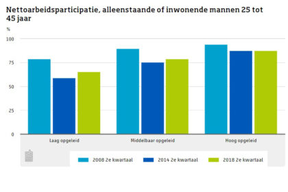 Nieuws Arbeidsdeelname van mannen 25-45 jaar lager dan voor crisis 18 oktober 2018 door Hinke Wever Vooral de arbeidsdeelname van alleenstaande mannen van deze leeftijd blijft achter. Bij vrouwen in de leeftijd 25-45 jaar is de arbeidsdeelname sinds de crisis juist toegenomen. [Lees meer …]