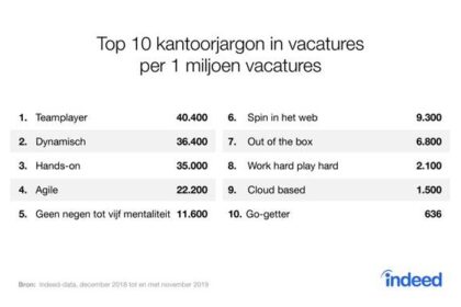 Nieuws Werkgevers gebruiken veel kantoorjargon in vacatures 10 maart 2020 door Hinke Wever Werkgevers doorspekken hun vacatures met kantoorjargon. Het taalgebruik van werkzoekenden in cv’s sluit niet altijd aan bij dat van de werkgevers in vacatures. Het woord ‘enthousiast’ komt het vaakst voor in vacatureteksten, terwijl wij dat woord een stuk minder voorkomt in cv’s, volgens Indeed. [Lees meer …]